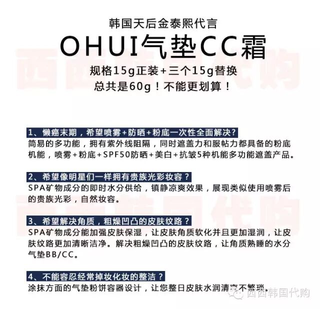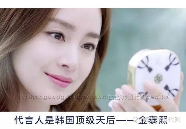金泰熙代言的哦~这款限量的气垫CC霜真的超级实惠!正装15g加三个15g的替换装,总共是60g!不仅是价格优惠,功效也超给力的,防晒粉底一次性全面解决,像明星一样拥有光彩妆容,SPA矿物质成分能加强肌肤的保湿,让皮肤角质软化并且更加滋润。