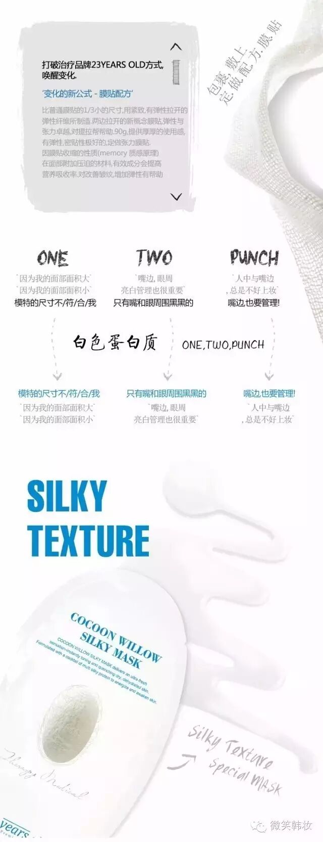 23岁蚕丝面膜足足43g精华液的面膜!就能让你想让他闭嘴的人闭嘴,你说这是不是一张神奇的面膜,23years old 就是永保23岁的意思~这是一款真正的蚕丝面膜这款面膜采用了新颖的弹力面膜贴✔具有紧致肌肤的效果,高浓缩蛋白质精华成分极高。 此外这款面膜将嘴部也完全遮盖,可全面提亮脸部肌肤,补充营养