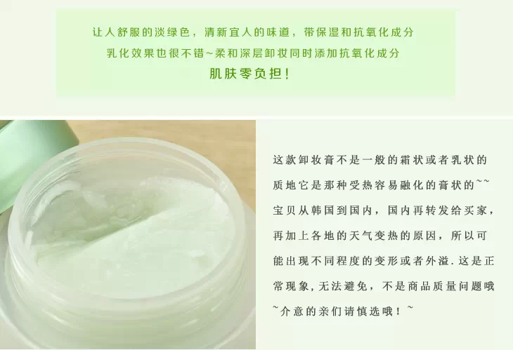 PS:此系列卸妆霜接触面部温度就会融化。因外界温度过高而导致膏体融化属正常现象。MM们收到后,如发现此种情况,觉得用起来不方便的话,可放置阴凉处或冰箱里冷却哦。